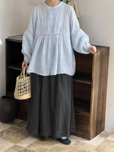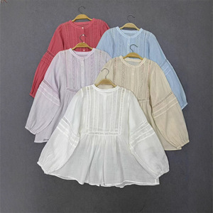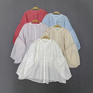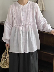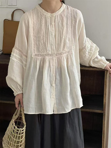 日系甜美秋季气质百搭圆领压褶设计感拼接镂空蕾丝钩花泡泡袖衬衫