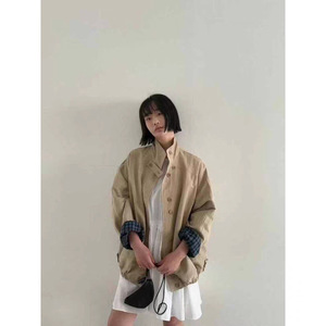 不退不换2025秋季新款韩版宽松立领单排扣撞色条纹长袖风衣外套女