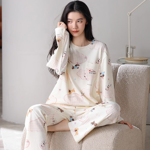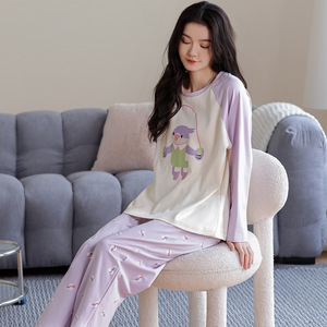纯棉睡衣女士春秋季2025新款休闲宽松卡通长袖长裤条纹家居服套装
