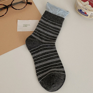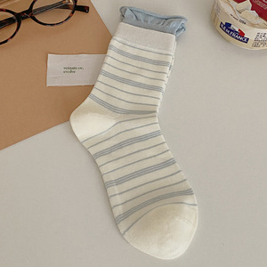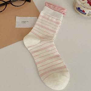 袜子女春秋纯棉森系条纹秋冬中筒袜ins潮复古双罗口卷边堆堆袜