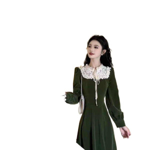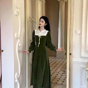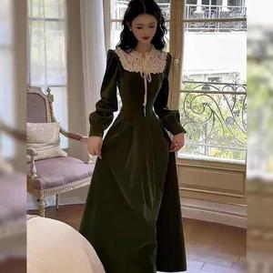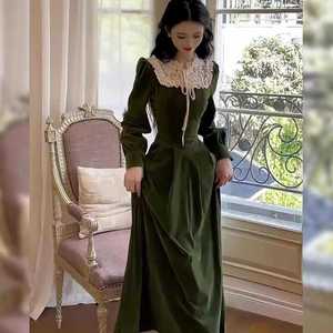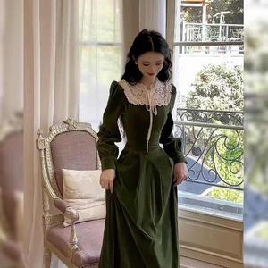 设计师蕾丝拼接连衣裙2025秋季新款法式复古气质绿色轻奢丝绒长裙