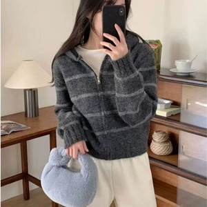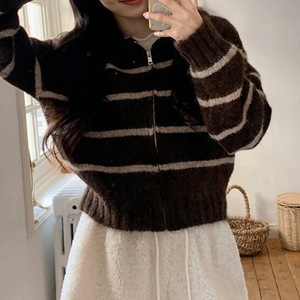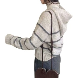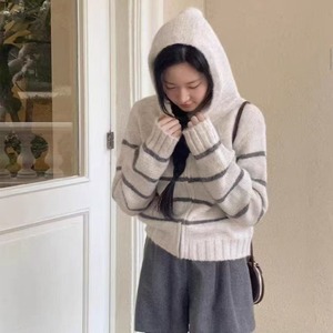 韩版撞色条纹连帽长袖毛衣外套女2025秋冬新款慵懒风针织开衫上衣