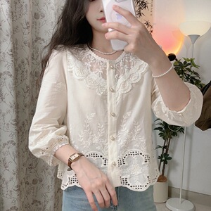 新款早秋七分袖衬衫女新款淑女小衫宽松甜美百搭上衣女杏色