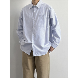 ONUN日系复古蓝白条纹牛津纺长袖衬衫宽松休闲翻领工装衬衣外套潮