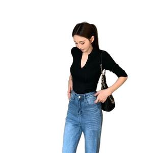 复古修身v领长袖针织衫女装秋季紧身显瘦打底衫气质chic百搭上衣