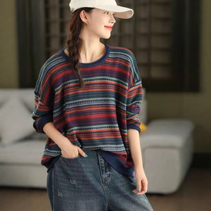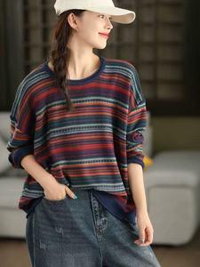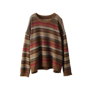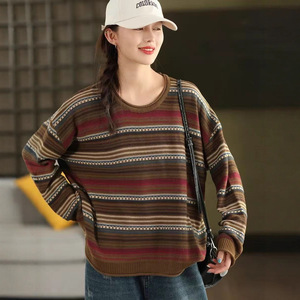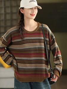 秋季新款 复古重工提花针织棉线毛衣女圆领长袖套头衫上衣0472