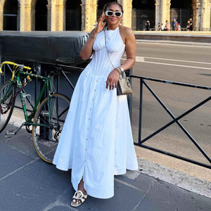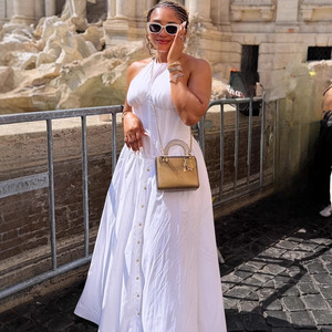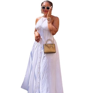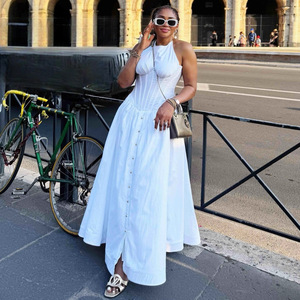 欧美女装气质收腰白色优雅中长款连衣裙女非洲新款排扣大摆长裙女