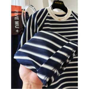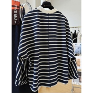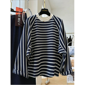 【胖妹妹】韩系复古撞色条纹长袖t恤女早秋松弛感宽松百搭上衣服