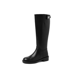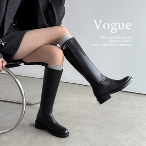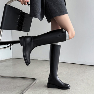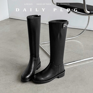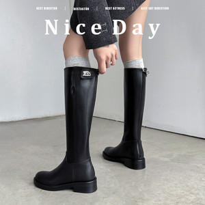 大小筒围平底辣妹街头百搭圆头骑士靴2025冬季金属锁扣后拉链长靴