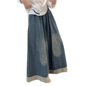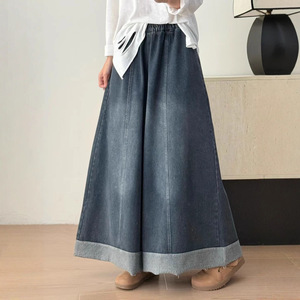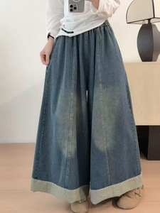 拼接水洗牛仔阔腿裤女2025秋新款松紧腰复古文艺宽松大码裙裤 505