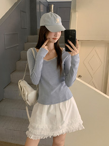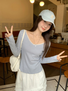 蓝白条纹蕾丝边露锁骨V领长袖T恤女秋季新款内搭打底衫修身上衣