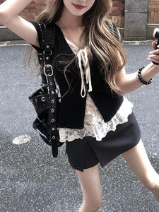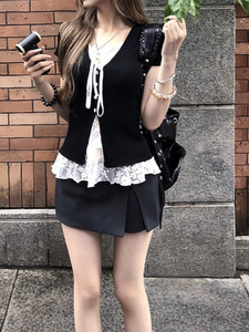 纯欲风短袖T恤设计感蕾丝V领夏季2025新款修身黑色正肩假两件上衣