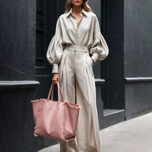 FD2205 现货2025欧美秋季新跨境纯色长袖衬衣阔腿裤棉麻两件套装
