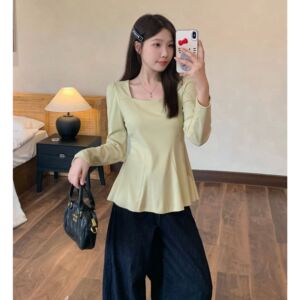 2025夏装新款胖mm大码收腰百褶下摆长袖T恤纯欲方领正肩上衣