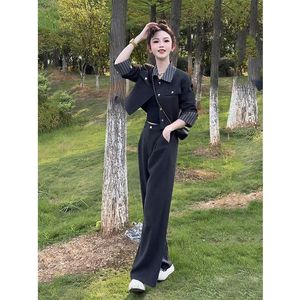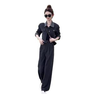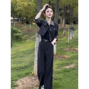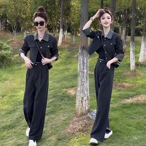 韩版时尚套装女2025春季新款设计感条纹拼接polo领小香风外套裤子
