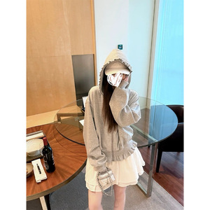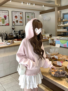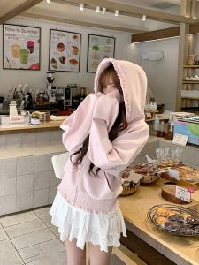 2025春秋季粉色拉链连帽卫衣外套女慵懒宽松木耳边长袖上衣开衫潮