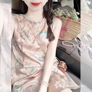 新中式国风粉色印花无袖连衣裙女2025夏季新款绝美改良旗袍短裙子