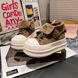 2025新款磨砂真皮翻领两穿系带厚底松糕饼干鞋短靴休闲高帮鞋女鞋