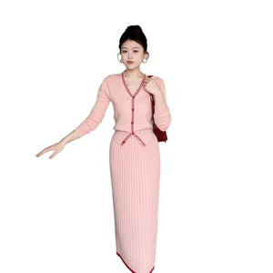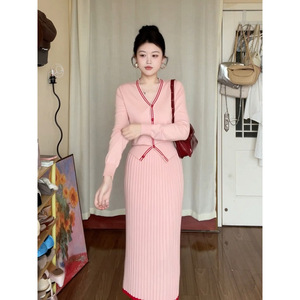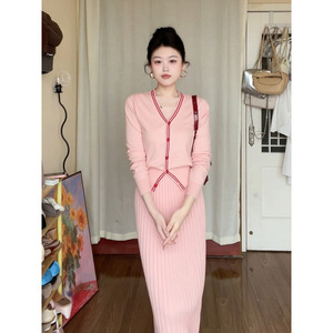 学院风套装女秋冬季新款V领毛衣开衫高腰针织百褶半身裙两件女