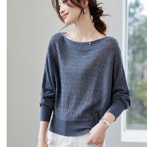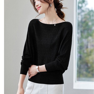 一字肩蝙蝠袖t恤女春秋宽松百搭小个子遮肚镂空薄针织衫打底上衣