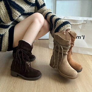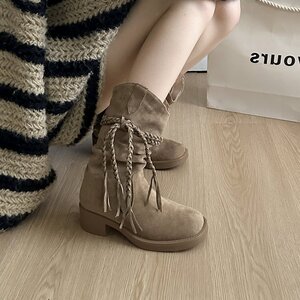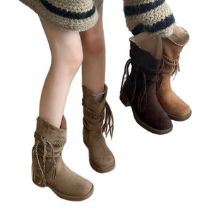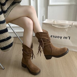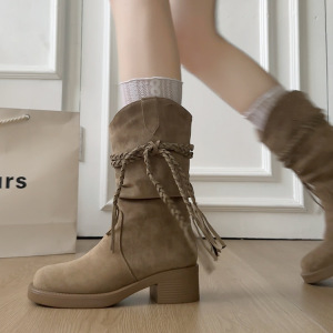 流苏堆堆靴子女2025秋季新款废土风流粗跟中筒靴中跟显瘦西部靴女