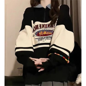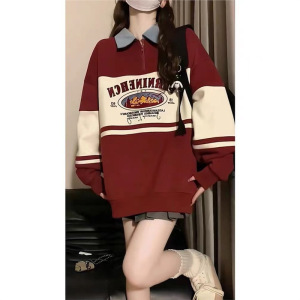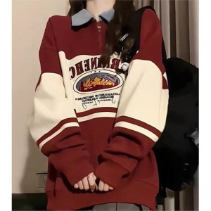 POLO领酒红色卫衣女秋冬新款加绒宽松慵懒撞色学院风美式复古上衣