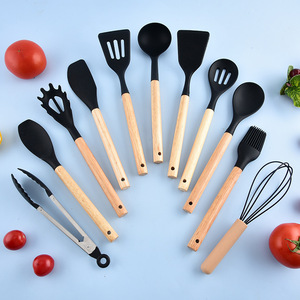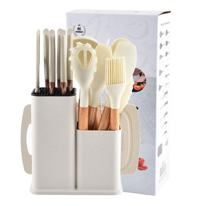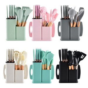 厂家硅胶厨具19件套木柄厨房硅胶套装铲汤勺带收纳桶不粘锅