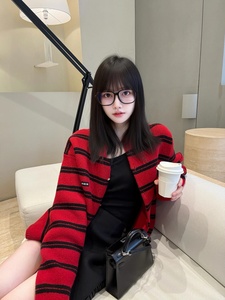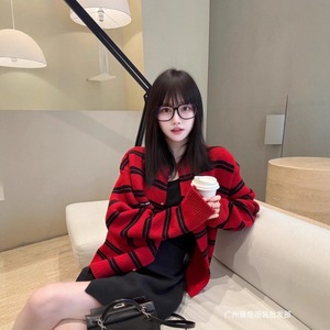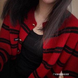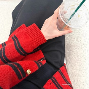 MIU系穿搭圣诞红色条纹针织毛衣开衫女秋冬字母贴布宽松上衣