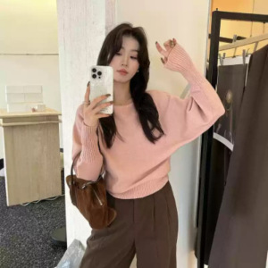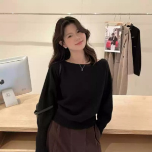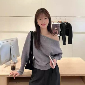 韩系温柔风斜肩一字领灯笼袖针织衫女装2025穿搭宽松别致小衫上衣