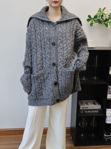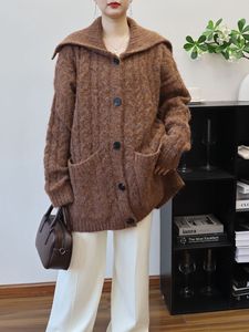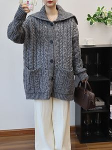 2025秋冬新款中长款翻领韩版宽松麻花针织开衫慵懒风毛衣外套女潮