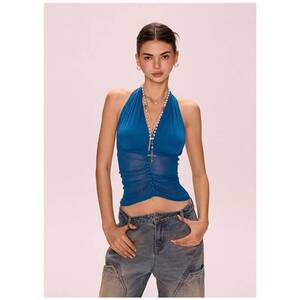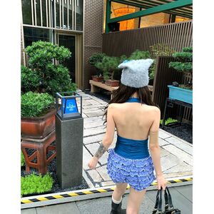 潮流甜辣风挂脖褶皱纽扣背心女秋季2025新款修身显瘦薄款露背上衣