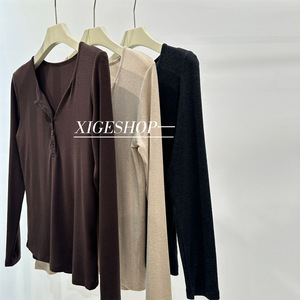 美拉德咖色亨利领长袖T恤女秋冬软糯亲肤质感天丝羊毛显瘦内搭tee