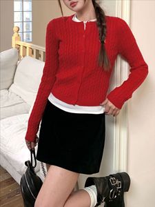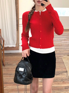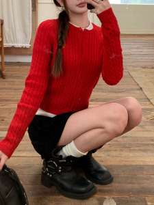 GZ线上商店新款红色针织开衫麻花纹短款学院风新年毛衣外套女