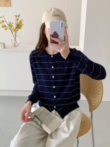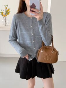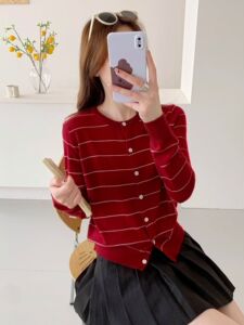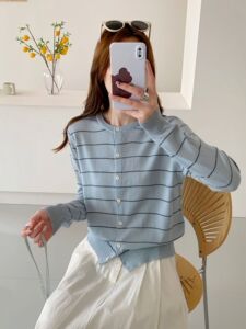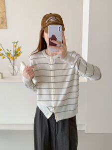 2025早秋新款撞色条纹针织开衫毛衣高级感时尚百搭圆领打底上衣女