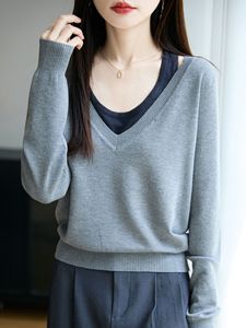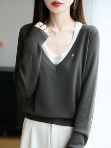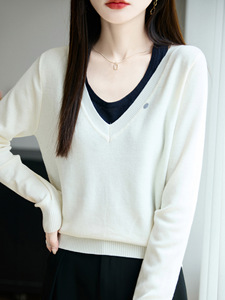 撞色V领假两件针织衫女秋新款精纺羊毛衫设计感内搭拼色打底上衣