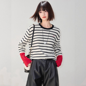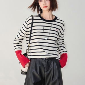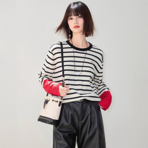 2025秋季新款女装高级感撞色条纹针织衫女早秋套头毛衣圆领t上衣