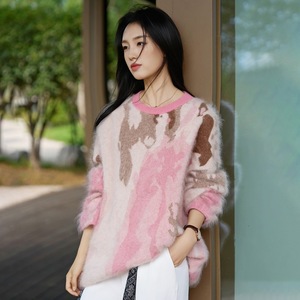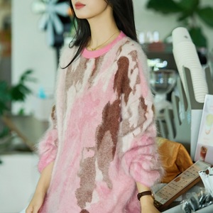 羊毛羊绒混纺衫女式圆领加厚毛衣拉绒工艺秋冬新款油墨画长袖内搭