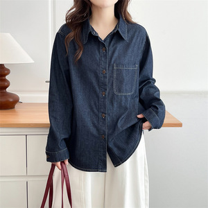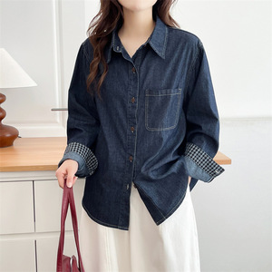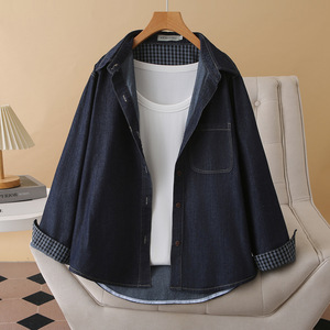 2025秋大码牛仔衫女长袖格子拼接开衫显瘦翻领上衣胖mm外套9678