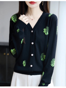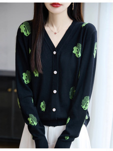 哥家商场同款女装2025秋季羊毛宽松V领提花气质针织开衫外套