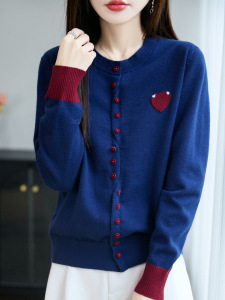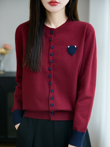 撞色小香风拼色针织开衫女秋季新款爱心圆领上衣宽松针织毛衣外套