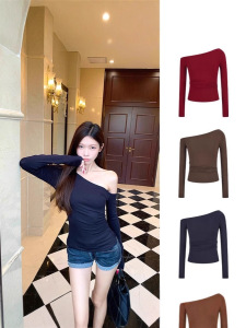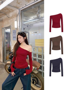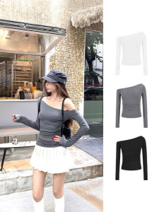 欲辣妹修身显瘦露肩长袖T恤女装早秋设计感百搭打底衫学生秋上衣