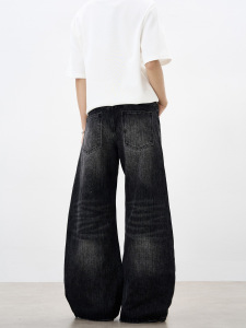 美式复古黑色竹节纹弯刀牛仔裤男水洗猫须阔腿宽松显瘦慵懒裤子潮