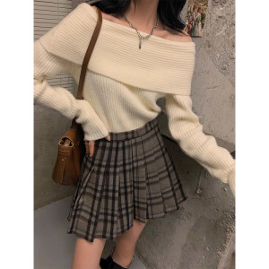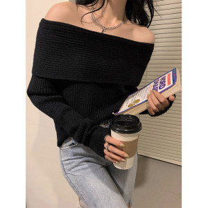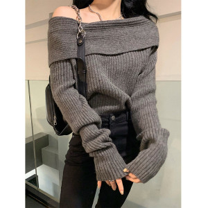 露肩慵懒风加厚一字肩毛衣女秋冬季新款辣妹设计感一字领针织上衣