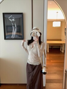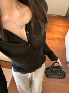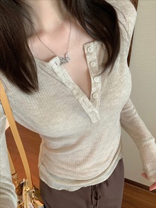 e go studo 通勤显瘦日常简约半开扣肌理长袖T恤女修身显瘦上衣