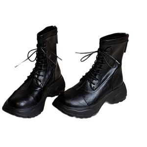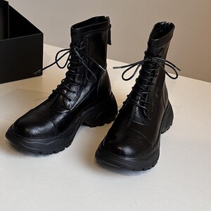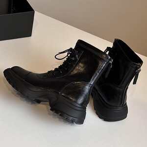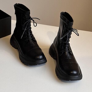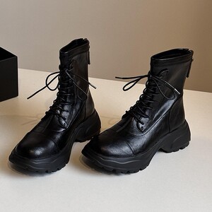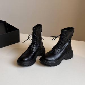 羊皮版~英伦风圆头粗跟后拉链短筒马丁靴显瘦厚底舒适百搭时装靴