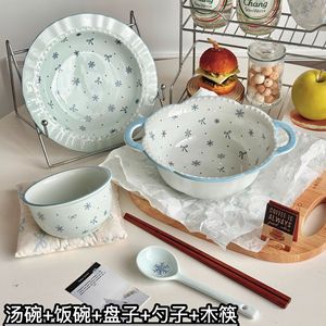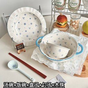 【3件套】初雪蓝大汤碗+勺子+木筷