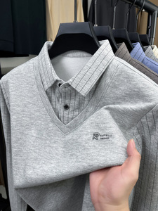 男士POLO衫长袖秋季轻奢高级感假两件拼接条纹含羊毛打底T恤上衣