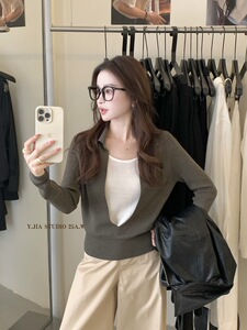 高级感假两件毛衣翻领设计感针织衫女秋新款修身显瘦百搭气质上衣