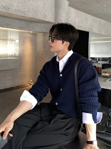 韩系男士针织开衫春季新款百搭小众设计麻花纹高端毛衣休闲上衣潮