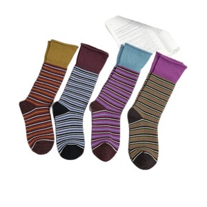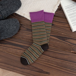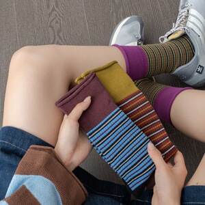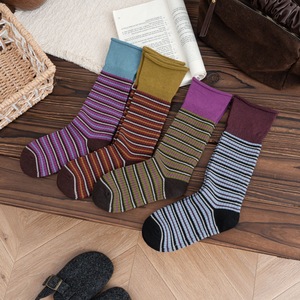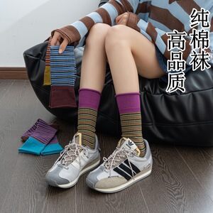 无骨条纹双罗口袜子女中筒袜春秋冬季撞色复古纯棉堆堆袜诸暨长袜